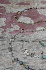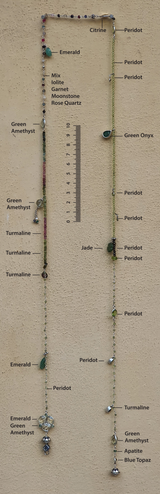 A scattering of citrines, peridot, green onyx, spruce amethyst, tourmaline, apatite and a noble emerald.