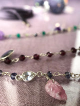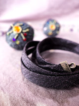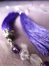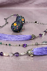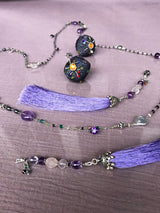 The tenderness and harmony of the set will reveal the violet tassels of silk thread and the pompon charm with oriental motives.