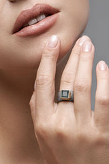 The ring has a unique design, blackened silver, with a tourmaline on the underside.