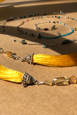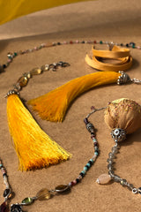 The tenderness and harmony of the set will reveal yellow tassels of silk thread and pompom pendants with oriental motives.
